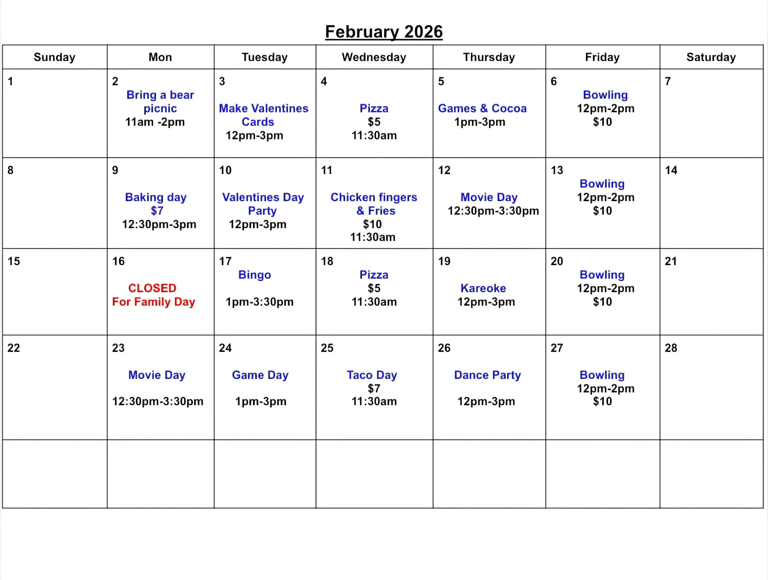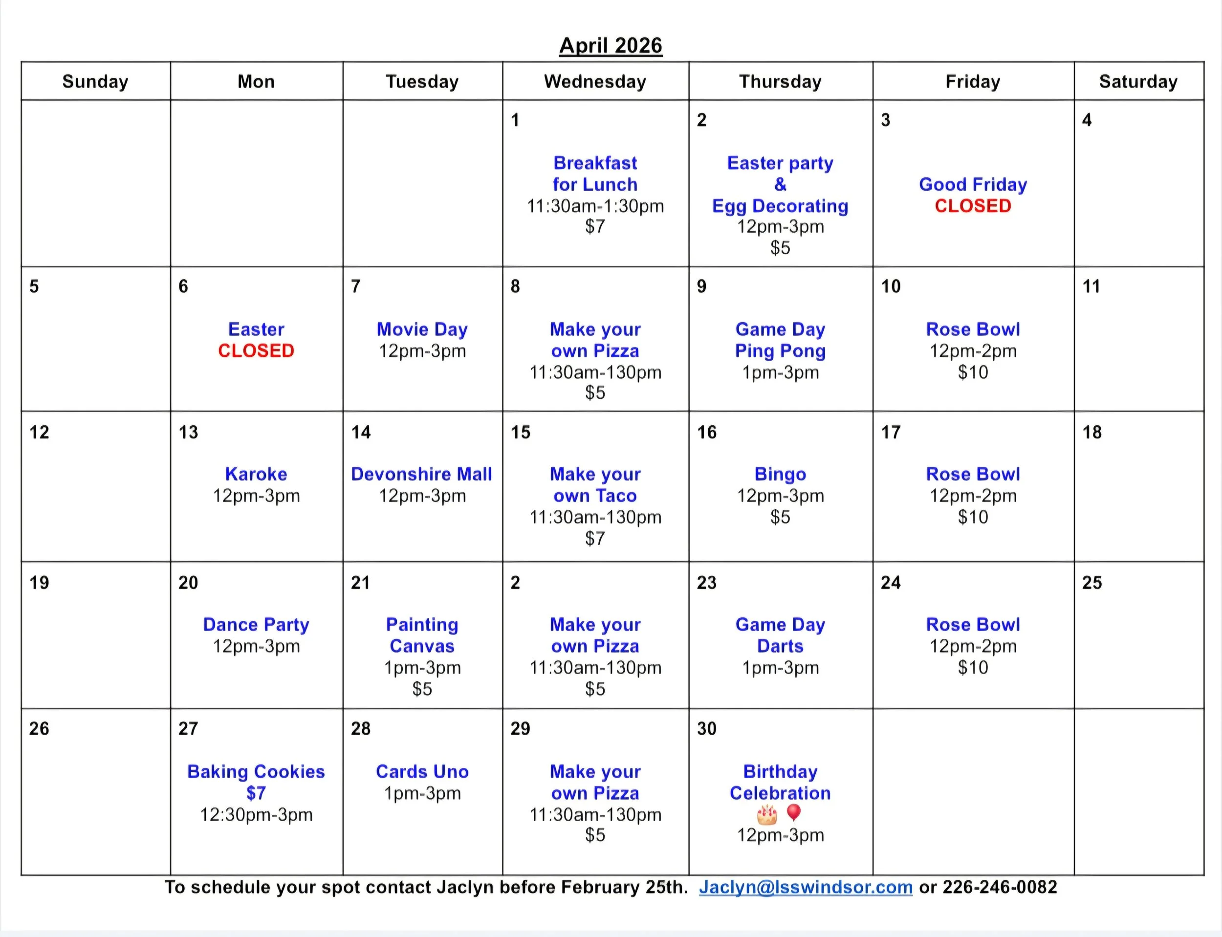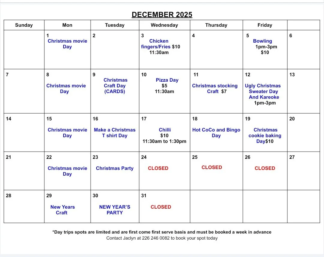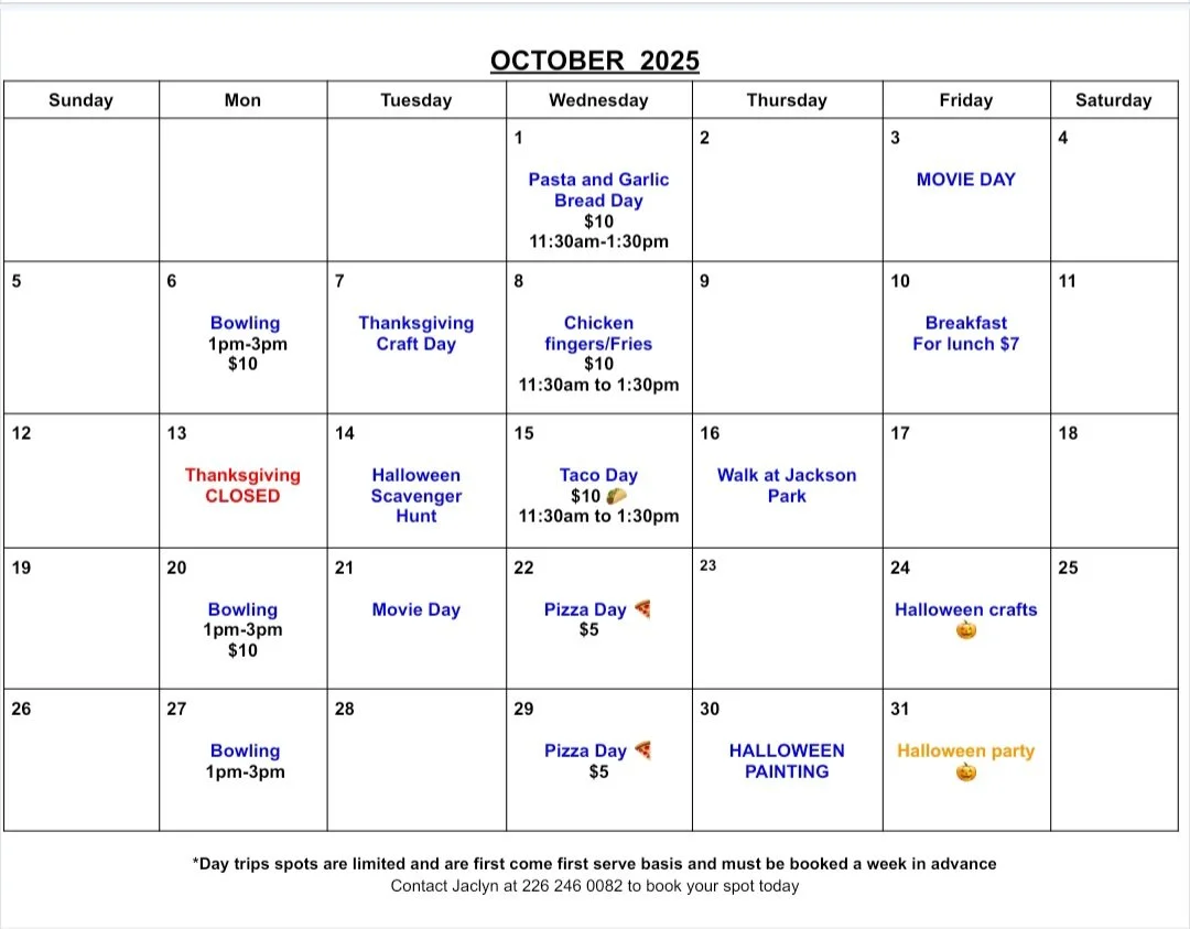 Contact Jaclyn at 226-246-0082 to book activities you would like to participate in.
